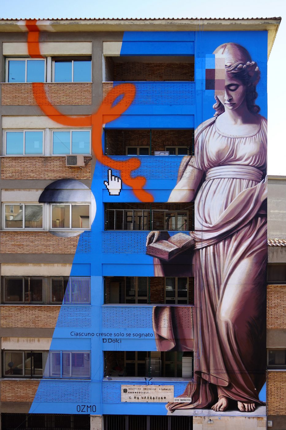Un’opera d’arte pubblica impressa sulle mura dell’IIS Enzo Ferrari di Roma, sede operativa dell’associazione daSud e del suo progetto educativo ÀP-Accademia Popolare dell’antimafia e dei diritti, che raffigura Sophia, simbolo di conoscenza e saggezza, che viene interpretata e rappresentata sotto forma di dea che si eleva a invito a lottare per la giustizia, la trasparenza e il diritto a un futuro migliore. A firmarla è l’artista di fama internazionale Ozmo, che questa mattina l’ha inaugurata negli spazi di Via Contardo Ferrini 83 a Cinecittà-Don Bosco, insieme alla scuola e all’associazione daSud.