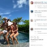 In costume da bagno, passeggia sulla splendida spiaggia della Maldive e pochi secondi dopo raggiunge tre bellissime ragazze intente a prendere il sole a bordo piscina.