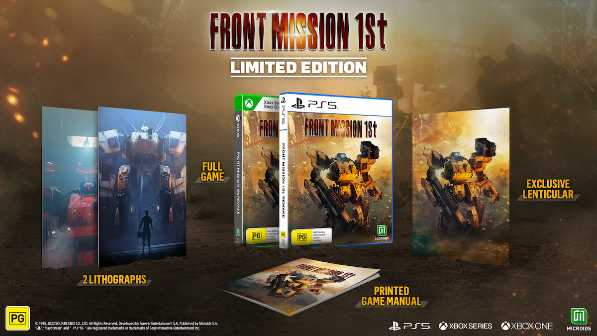 Arriverà su PlayStation 5 e Xbox Series|One il 5 dicembre 2023 il gioco Front Mission 1St Remake Limited Edition (Microids), con una versione retail unica. Ideata da Microids, questa Limited Edition contiene contenuti fisici esclusivi realizzati dagli artisti che hanno dato vita al gioco. Nel dettaglio, i contenuti sono il gioco Front Mission 1St Remake, un’esclusiva figurina lenticolare, il manuale di gioco stampato e due litografie.