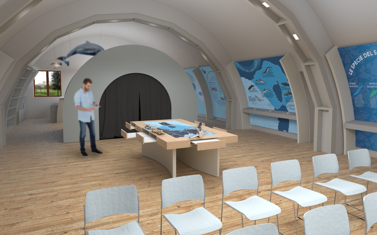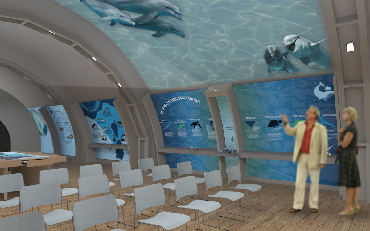 Fulcro emozionale del nuovo percorso di visita è una multiproiezione a soffitto, interattiva e immersiva, sulle specie marine del Santuario. Scegliendo uno tra i diversi modelli tridimensionali esposti (che riproducono altrettante specie marine) e posizionandolo su un apposito supporto, i visitatori attivano una vista nella volta realizzata con riprese originali subacquee o di superficie, che racconta la specie rappresentandola nel suo meraviglioso habitat. Il punto di vista dal basso porta l’osservatore stesso a sentirsi immerso nell’acqua. E a condividere così con gli abitanti del mare caratteristiche e rischi del loro ambiente di vita.