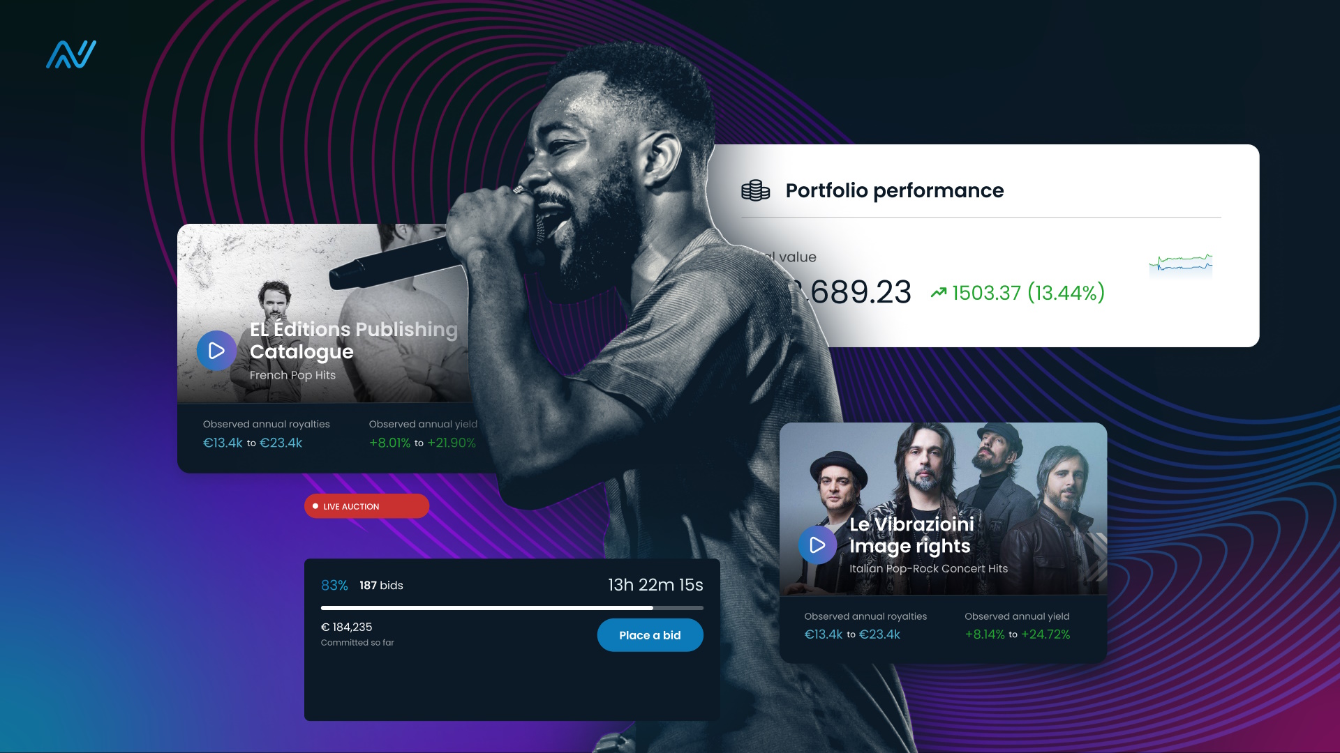 La piattaforma offre la possibilità di vendere i diritti della propria musica, con un nuovo sistema di monetizzazione. Le nuove possibilità di investimento rendono gli utenti partecipi del percorso degli artisti, in modo semplice e trasparente. I cataloghi musicali dei detentori dei diritti sono sottoposti a un processo di due diligence, durante il quale vengono esaminati lo storico, i contratti e le potenzialità future dei cataloghi prima che questi siano messi all’asta. Durante le aste, gli investitori e gli appassionati di musica possono acquisire quote dei cataloghi musicali e, al termine, queste andranno a far parte del loro portafoglio di investimenti.