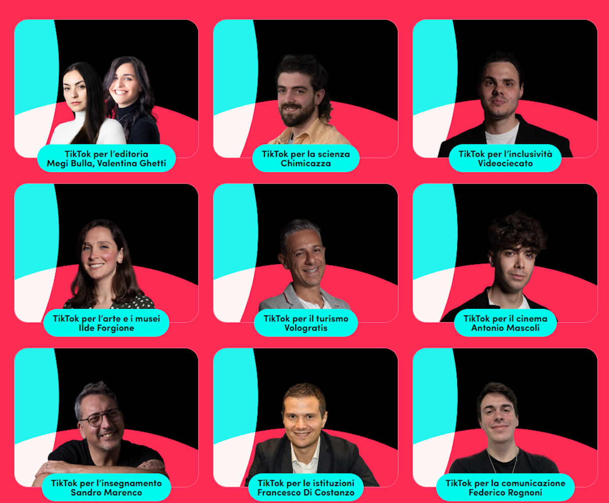 I primi creator coinvolti possono considerarsi dei veri e propri precursori nella divulgazione digitale su TikTok. Persone che hanno saputo – attraverso i format e il linguaggio tipici della piattaforma di intrattenimento – veicolare a un pubblico di massa le proprie conoscenze nelle più differenti discipline: Ilde Forgione per arte e musei, Antonio Mascoli per il cinema, Sebastiano Gravina per l’inclusività, Andrea Petroni per il turismo, Federico Rognoni per la comunicazione, Megi Bulla e Valentina Ghetti per l’editoria, Sandro Marenco per l’insegnamento, Alessandro per la chimica, Francesco Di Costanzo per le istituzioni.