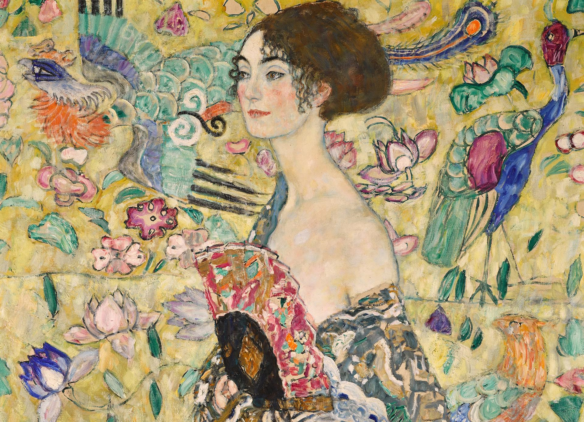 La storia riferisce che Gustav Klimt era ancora al lavoro, in piedi davanti al cavalletto nel suo studio, quando la morte lo colse prematuramente. Era il febbraio 1918 e l’artista stava lavorando alla Dama con ventaglio, seducente ritratto di una donna senza nome che testimonia tutta l’abilità tecnica e l’esuberanza creativa di Klimt. Il pittore stava sperimentando una rinnovata espressività, profonda e gioiosa che trovava linfa nella totale immersione nel disegno, nel colore e nella forma. Forte l’influenza dei contemporanei Van Gogh, Matisse e Gauguin, che Klimt declinò in maniera del tutto personale.
