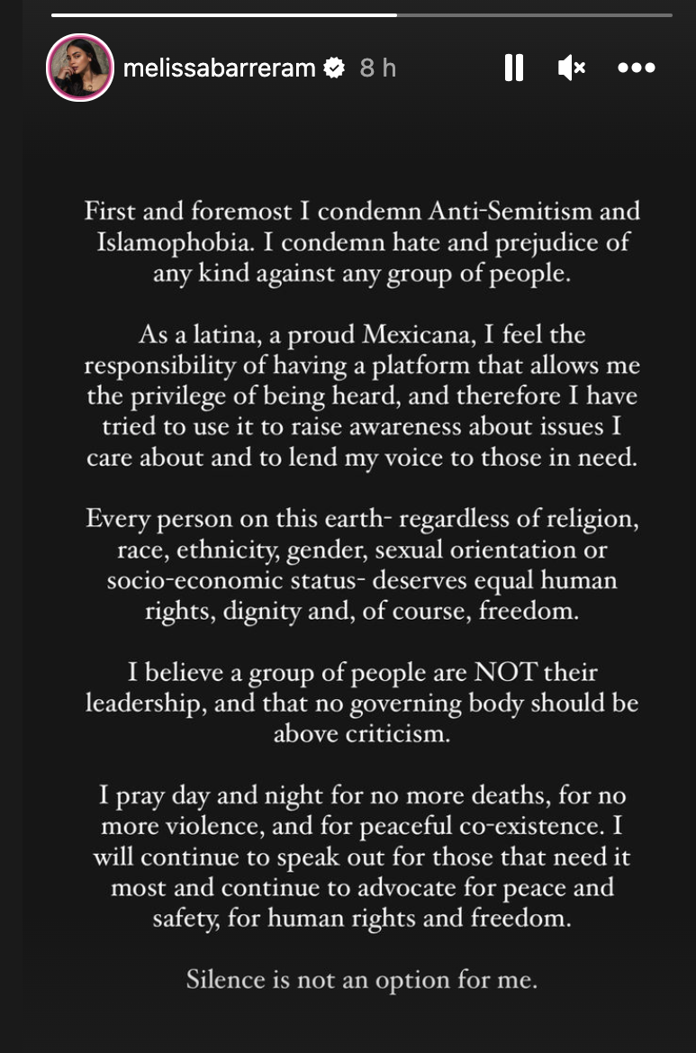 «In primo luogo, condanno sia l’antisemitismo che l’islamofobia. – scrive l’attrice in una story su Instagram – Condanno l’odio e il pregiudizio di ogni tipo verso ogni gruppo di persone. Da Latina, e orgogliosa messicana, sento la responsabilità di avere una piattaforma che mi concede il privilegio di essere ascoltata. E quindi ho provato ad usarla per aumentare la consapevolezza sui problemi che mi interessano e per prestare la mia voce a chi ne ha bisogno».