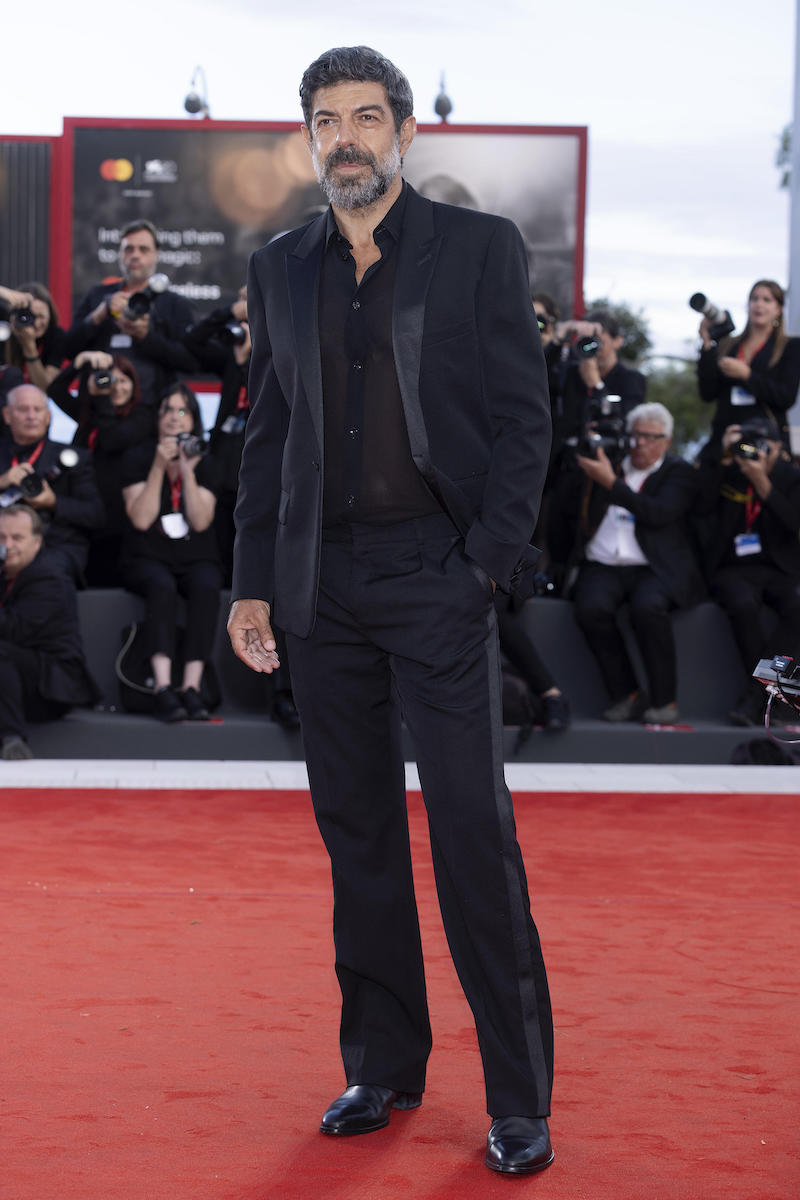 Abito di marchio straniero per Favino che sostiene che i ruoli italiani nei film stranieri dovrebbero andare ad attori italiani. Io suggerirei di partire con l’indossare capi made in Italy sopratutto sul red carpet di Venezia. In ogni caso non approvo il suo look: abito con spalle troppo larghe di manifattura industriale, pantalone quasi a zampa d’elefante, stivaletto quasi a punta e, ciliegina sulla torta, camicia nera trasparente.