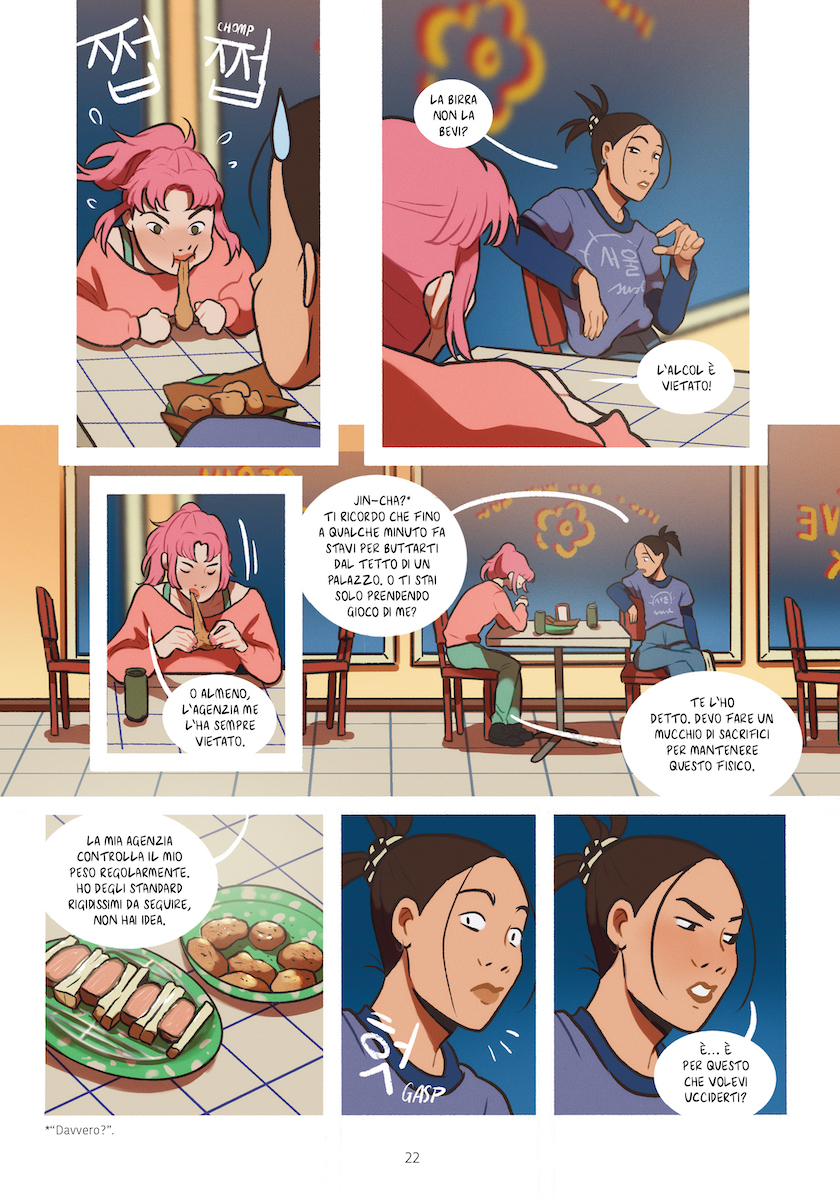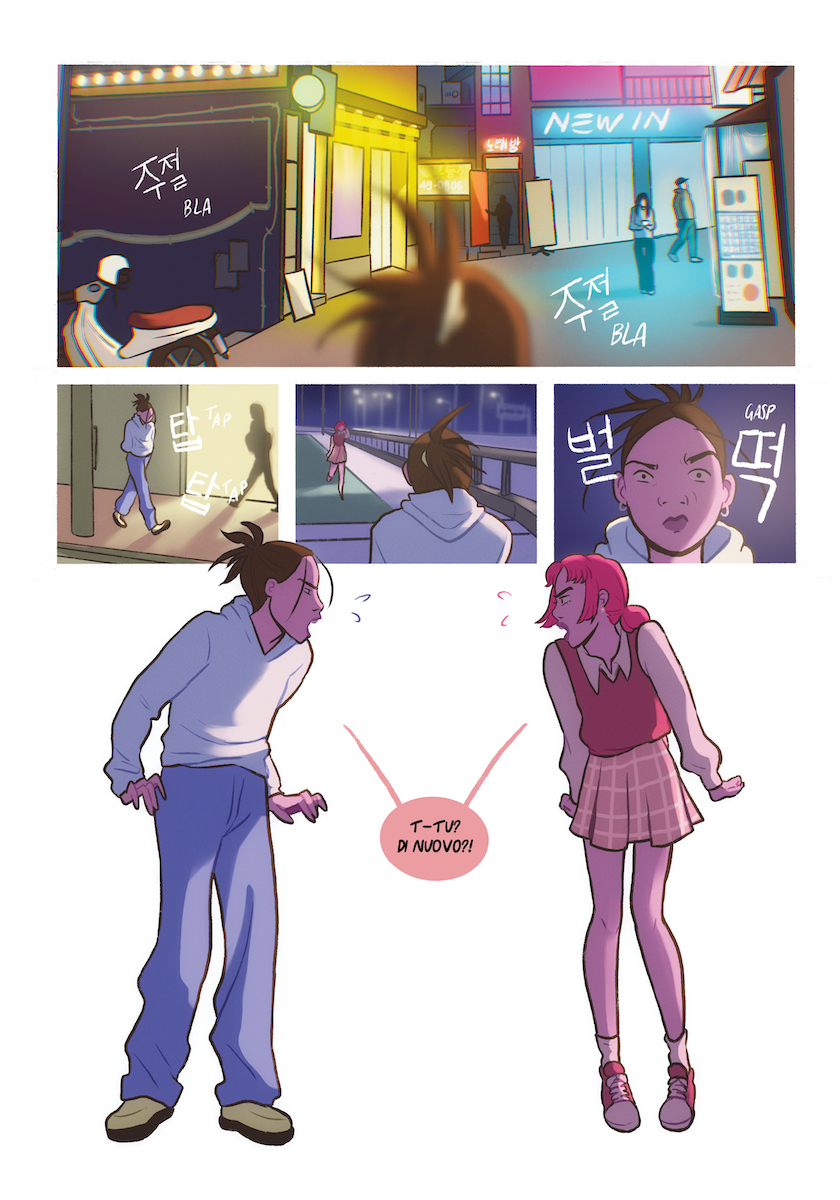 «Con le protagoniste di questo libro la sfida era riuscire a replicare i tratti asiatici, con Salut poi (per metà francese) è stato ancora più difficile perché qualche tratto occidentale doveva presentarlo. Ho cercato foto di idol coreani con queste caratteristiche, e studiato il design di personaggi come Mulan o i fumetti di Yudori, per vedere come altri disegnatori ne rappresentavano i tratti somatici. – ci dice ancora – Per la parte di narrazione invece è stato più facile: ho pensato a come due persone nella loro situazione potrebbero agire, e quali tratti del carattere le persone sviluppano in determinate situazioni. Ovviamente se fai fatica a sopravvivere, come Xin-Yeong, la tua visione del mondo sarà differente da una persona con dei privilegi come lo è Salut».