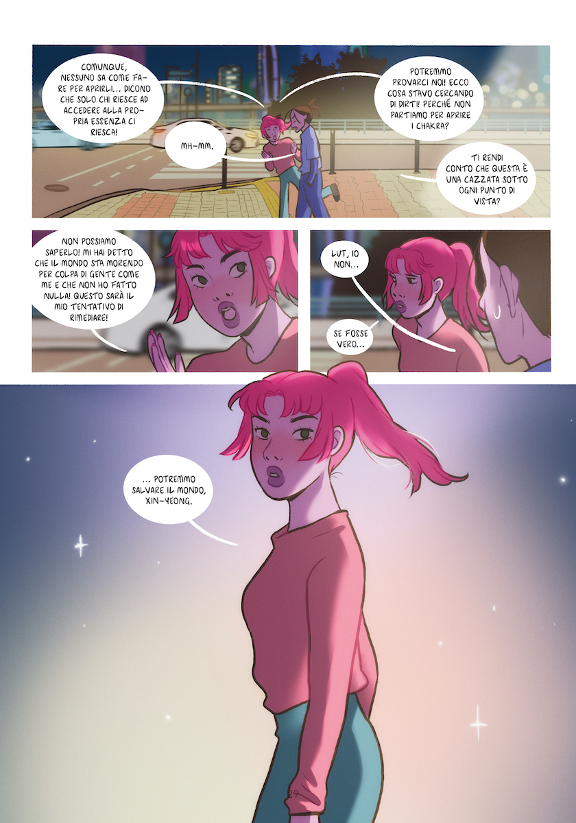 «In ogni chakra infatti le nostre protagoniste incontreranno un personaggio diverso che le aiuterà, il cui nome prende ispirazione da una traduzione diversa della parola ciao (come Salut e Xin-Yeong stesse), a simboleggiare un addio alla vita passata per riscoprire noi stessi in questo viaggio. – continua – Anche il tour mondiale di Salut infatti si chiama Bye Bye 2075, come a salutare il mondo per come lo conosciamo, dato che si dice che l’apocalisse sia vicina. Mi piaceva l’idea che da questo libro potesse nascere anche un dibattito tra scienza e spiritualità, cose che sono strettamente collegate poi al modo in cui viviamo la nostra vita di tutti i giorni, che era la parte principale della storia».