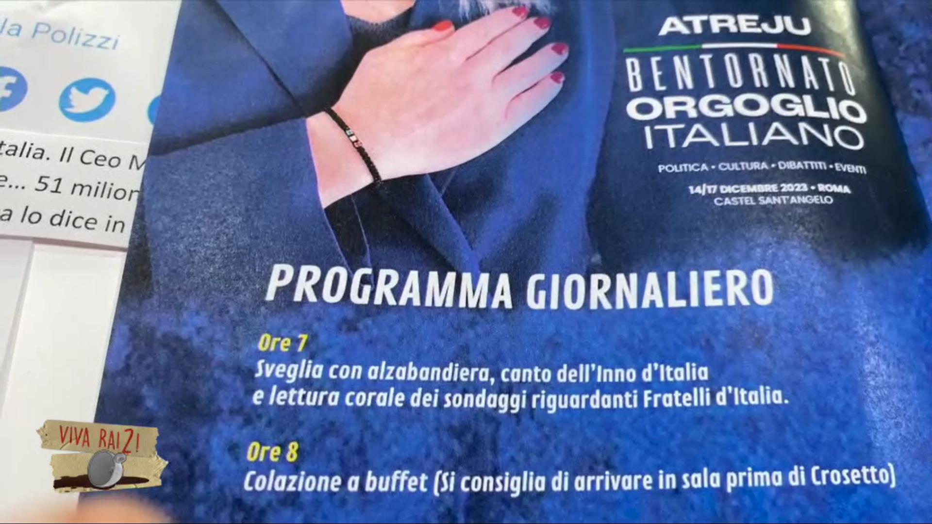 Dopo il Mes, Salvini, Renzi e Calenda, questa volta è toccato alla festa di Fratelli d’Italia, Atreju, di cui Fiorello ha letto il programma ‘ufficiale’. Ed è tutto un programma. Dall’apertura del baby club a cura di Ignazio La Russa al pranzo tradizionale “Ha fatto anche cose buone”. Dal laboratorio natalizio “Mille trucchi per fermare un treno” al tradizionale torneo di Calcio Balilla.