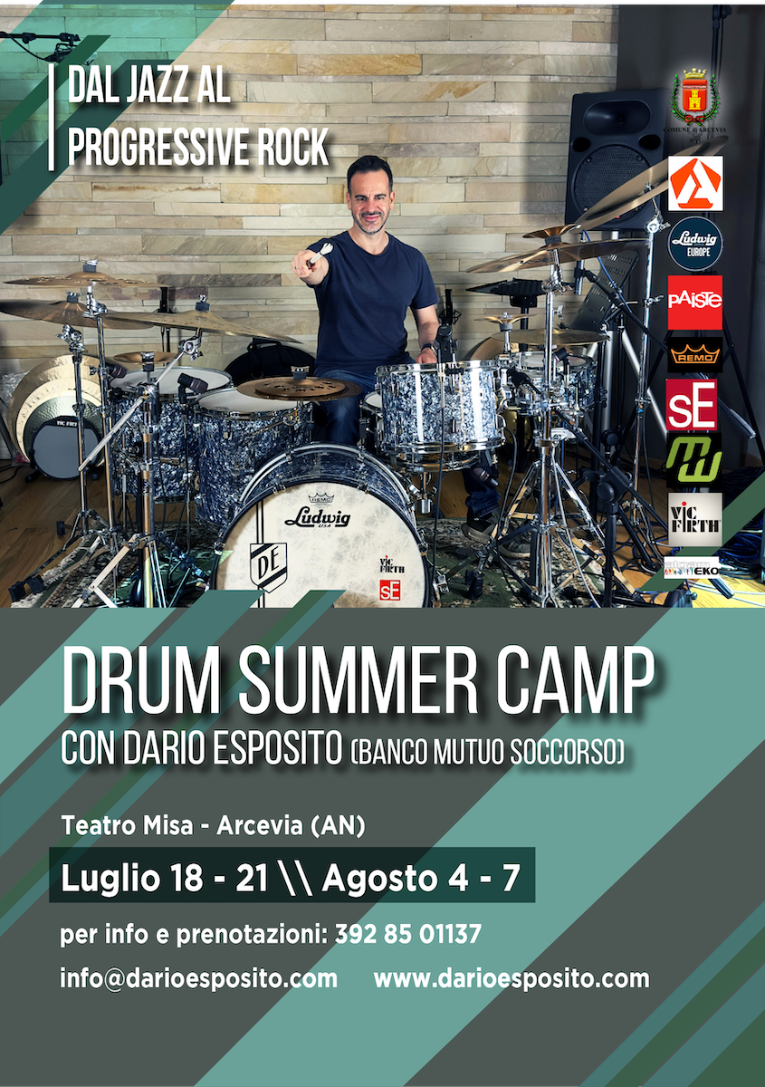 Parte anche quest’anno l’11º Drum Summer Camp di Dario Esposito, un vero e proprio viaggio nel ritmo e nella batteria in quattro giornate dove saranno attraversati i diversi linguaggi musicali che vanno dal jazz al progressive rock, fino ad arrivare all’elettronica ed ai linguaggi espressivi più moderni. Dario Esposito, attualmente batterista del Banco del Mutuo Soccorso, è da anni un artista, produttore e session man in studio e live con diverse collaborazioni all’attivo in diversi generi musicali.