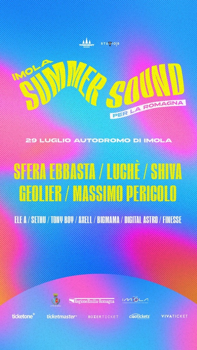 Oltre a Sfera Ebbasta, Luchè e Shiva saranno protagonisti sul palco Geolier e Massimo Pericolo. E poi tanti giovani artisti destinati a scalare le classifiche: Axell, Bigmama, Digital Astro, Ele A, Finesse, Sethu e Tony Boy. I biglietti sono disponibili su Ticket Master, TicketOne, Ciao Ticket, Viva Ticket, Boxer: www.tridentmusic.it/imolasummersound/