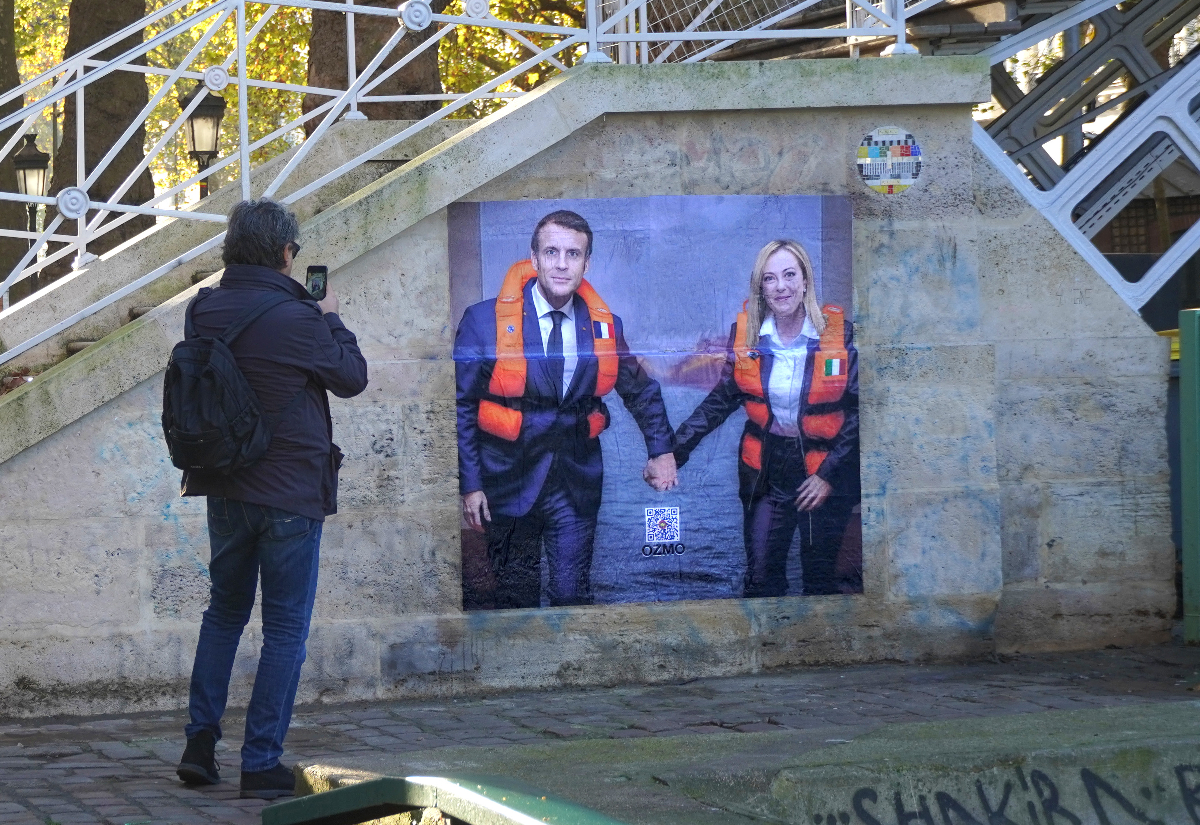 Il presidente francese Emmanuel Macron e la premier italiana Giorgia Meloni con i giubbotti salvagente arancioni, sorridenti e mano nella mano, con il mare sullo sfondo: questa l’instantanea artistica con cui lo street artist italiano Ozmo ripropone i due leader, realizzata sotto forma di disegno a colori digitalizzato e poi stampato in un affiche dalle dimensioni di 170×170 cm.