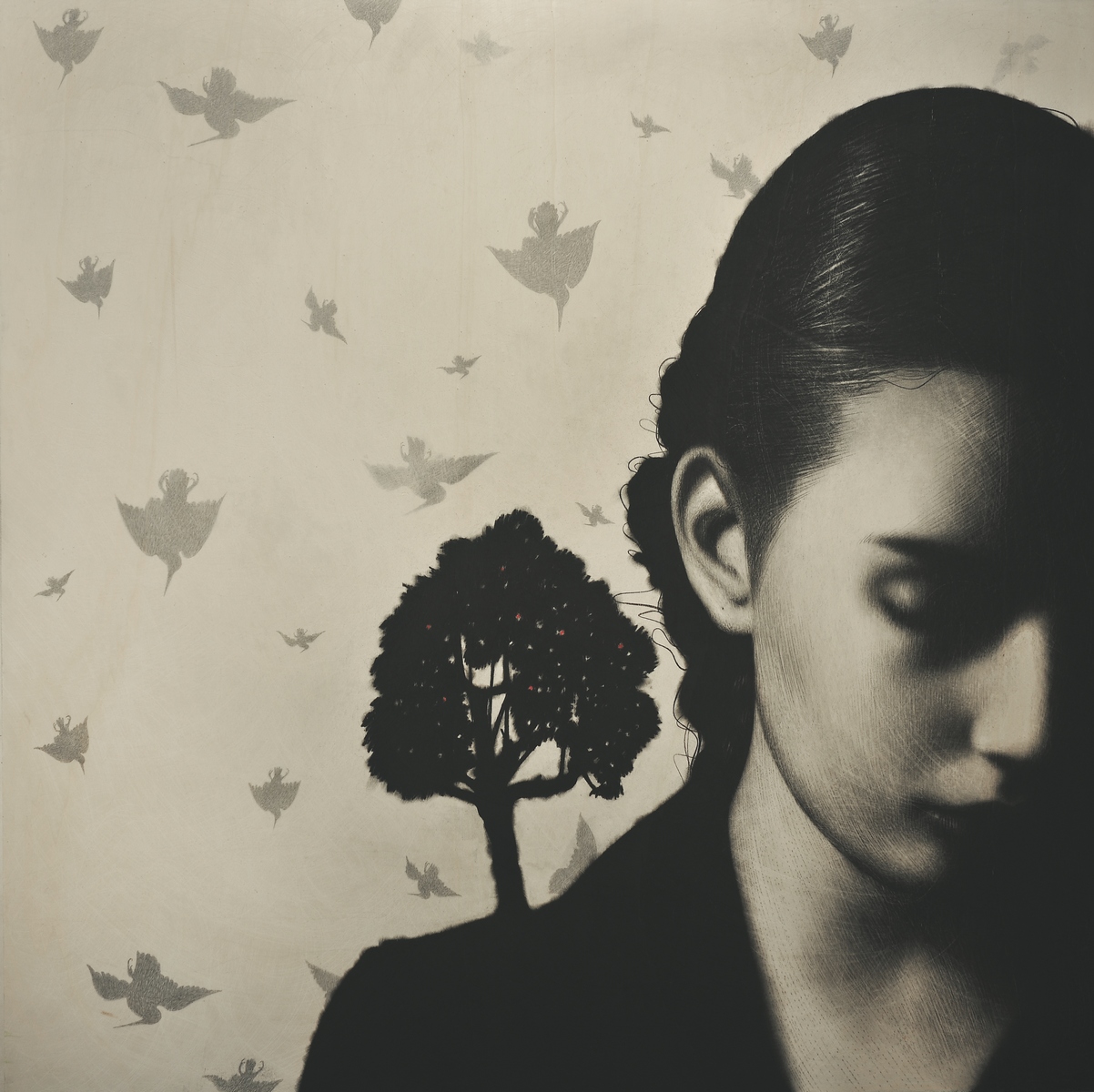 L’immagine guida dell’esposizione è De rerum natura (2020), una grande tavola che trae il titolo dal poema di Tito Lucrezio Caro. L’opera raffigura una giovane donna e un colibrì, simbolo di congiunzione tra cielo e terra, tra mondo fisico e spirituale.