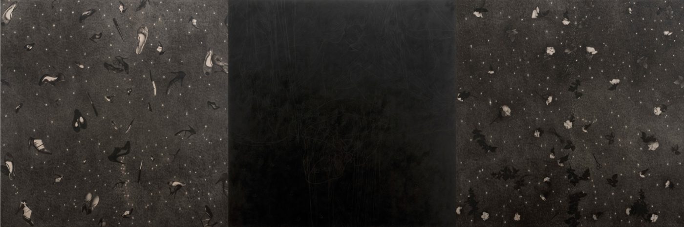 Si prosegue con un grande Mantra degli anni Novanta, giocato tra il mistero del nero della grafite e la sacralità della foglia d’oro incisa. A seguire, NGC/7419 del 2020-2021, lavoro particolarmente sentito, nato da un sogno ricorrente a seguito della perdita del figlio Massimiliano, anche lui artista. Un numero tornava costante nella mente: 7419; cercando in rete risultò essere un insieme di stelle nella costellazione di Cefeo, a forma di matita. Le stelle, di carbonio ed oro, splendono nell’opera a matita su tavola, silenti e liriche testimoni di quei misteri che non ci è dato sapere.