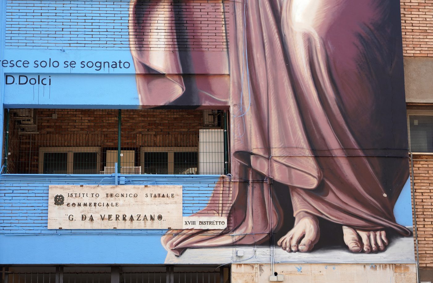 «Il murale – ha dichiarato l’artista – aspira a riflettere la complessità e la profondità degli obiettivi sia della scuola sia di daSud, associazione nota per il suo impegno nel contrasto socio-culturale delle mafie e nella promozione dei diritti civili. Mi auspico possa lasciare un’impronta che sia di ispirazione a tutte le persone che varcano la soglia di entrata dell’edificio: non solo sul muro fisico ma anche nelle menti e nei cuori di tutti coloro che ne fanno parte».