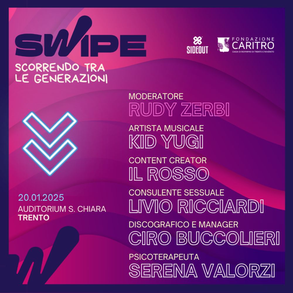Il progetto SWIPE – Scorrendo tra le generazioni prende il via con un primo talk che si terrà all’Auditorium Santa Chiara di Trento il 20 gennaio 2025. A partecipare saranno Rudy Zerbi che guiderà l’incontro, Livio Ricciardi (dottore in psicosessuologia clinica e consulente sessuale), Ciro Buccolieri (discografico e manager), Kid Yugi (artista rap), Il Rosso (content creator), Serena Valorzi (psicoterapeuta). Insieme saranno esplorati tanti aspetti della vita dei giovani d’oggi, creando un’occasione unica per immaginare un futuro dove tutte le generazioni possano capirsi e rispettarsi.