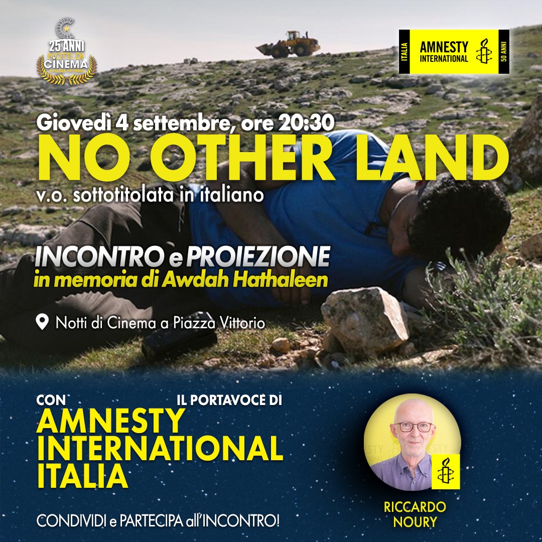 Giovedì 4 settembre proiezione speciale all'Arena Notti di Cinema a Piazza Vittorio in memoria di Awdah Hathaleen Giovedì 4 settembre alle ore 20:30, Notti di Cinema a Piazza Vittorio ospiterà la proiezione di No Other Land, vincitore dell'Oscar 2025 come Miglior Documentario. Ad introdurre la proiezione saranno: Riccardo Noury, portavoce di Amnesty International Italia, l'organizzazione per i diritti umani che ha dato il […]