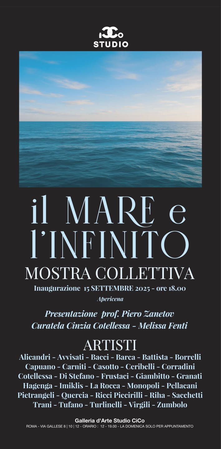 IL MARE E L’INFINITO Mostra collettiva d’arte contemporanea Roma, 15 – 29 settembre 2025 Galleria d’Arte Studio CiCo – Via Gallese 8 La Galleria d’Arte StudioCiCo è lieta di presentare la mostra collettiva “Il Mare e l’Infinito”, in programma dal 15 al 29 settembre 2025 presso la sede di Via Gallese 8 a Roma. L’inaugurazione […]