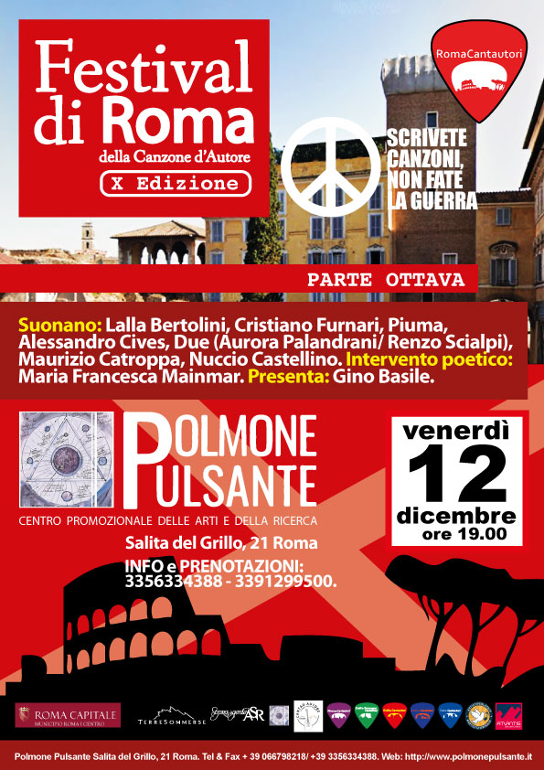 Il Festival di Roma della Canzone d’Autore torna con la sua decima edizione e propone l’ottava parte dal titolo “Scrivete canzoni, non fate la guerra”, in programma venerdì 12 dicembre alle ore 19.00 presso il Polmone Pulsante, in Salita del Grillo 21 a Roma. La manifestazione, che si distingue per la scelta di presentare soltanto […]