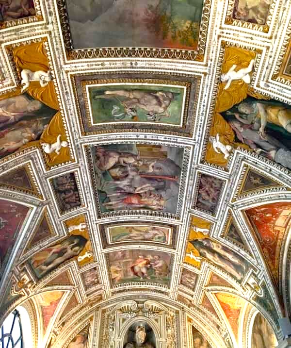 Il palazzo tardo rinascimentale, divenuto nel 1561 proprietà dei Medici, possiede un elegante cortile con prospetto interno ed elegante serliana dell’Ammannati; la loggia con decorazione ad affreschi e stucchi di Prospero Fontana; il “camerino” con volta affrescata da Jacopo Zucchi. Dal 1926 il Palazzo è sede della Società Dante Alighieri.