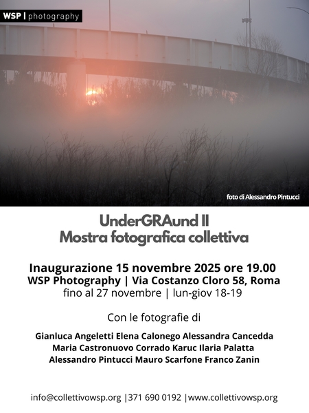 WSP Photography, è lieta di presentare “UnderGRAund II” la mostra fotografica collettiva che inaugurerà sabato 15 novembre alle ore 19 presso la nostra sede in Via Costanzo Cloro 58, Roma. La mostra fotografica “UnderGRAund II” è il risultato finale della edizione 2025 dell’omonimo laboratorio a cura di Daniela Silvestri e Massimiliano Tempesta che ha stimolato […]