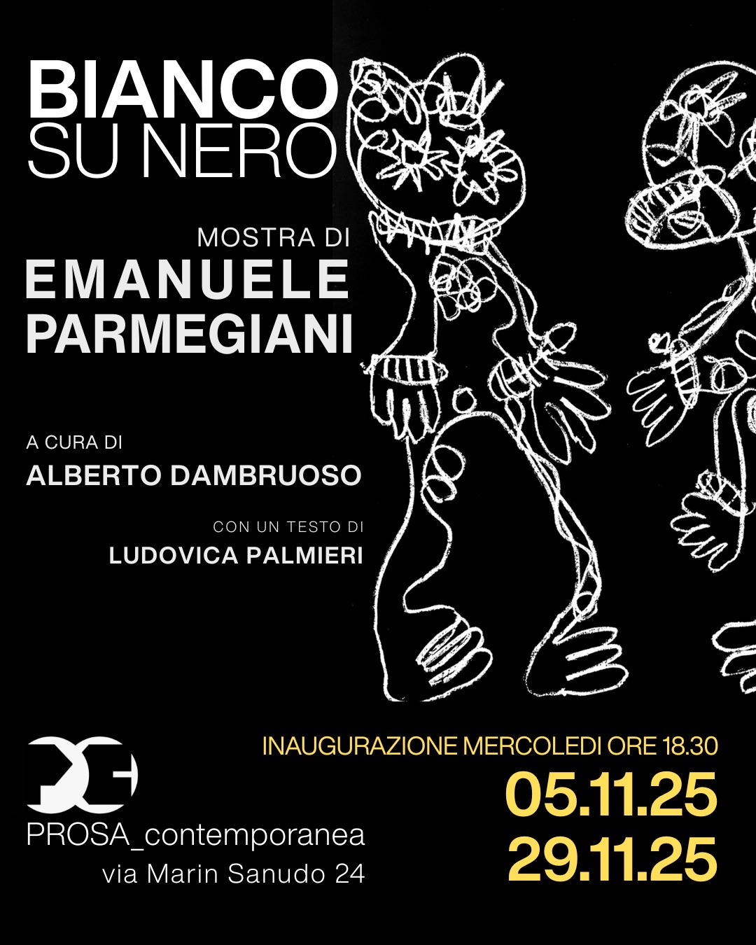 MANUELE PARMEGIANI BIANCO SU NERO A cura di Alberto Dambruoso Con un testo di Ludovica Palmieri Inaugurazione 5 novembre 2025 ore 18.30 PROSA_contemporanea Via Marin Sanudo 24 - Roma Fino al 29 novembre 2025 Mercoledì 5 novembre 2025 alle ore 18.30, PROSA_contemporanea presenta la mostra personale Bianco su nero di Emanuele Parmegiani a cura di […]