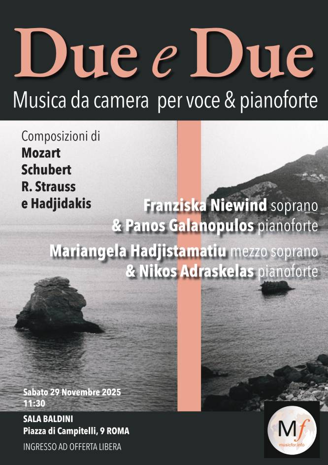 Nel concerto “Due e Due”, la soprano tedesca Franziska Niewind, accompagnata al pianoforte da Panos Galanopulos, aprirà la serata con un raffinato programma dedicato al repertorio liederistico tedesco. Le loro interpretazioni di Mozart, Schubert e Richard Strauss offriranno al pubblico un viaggio sonoro tra eleganza, lirismo e profondità emotiva. Nella seconda parte, la mezzosoprano Mariangela […]