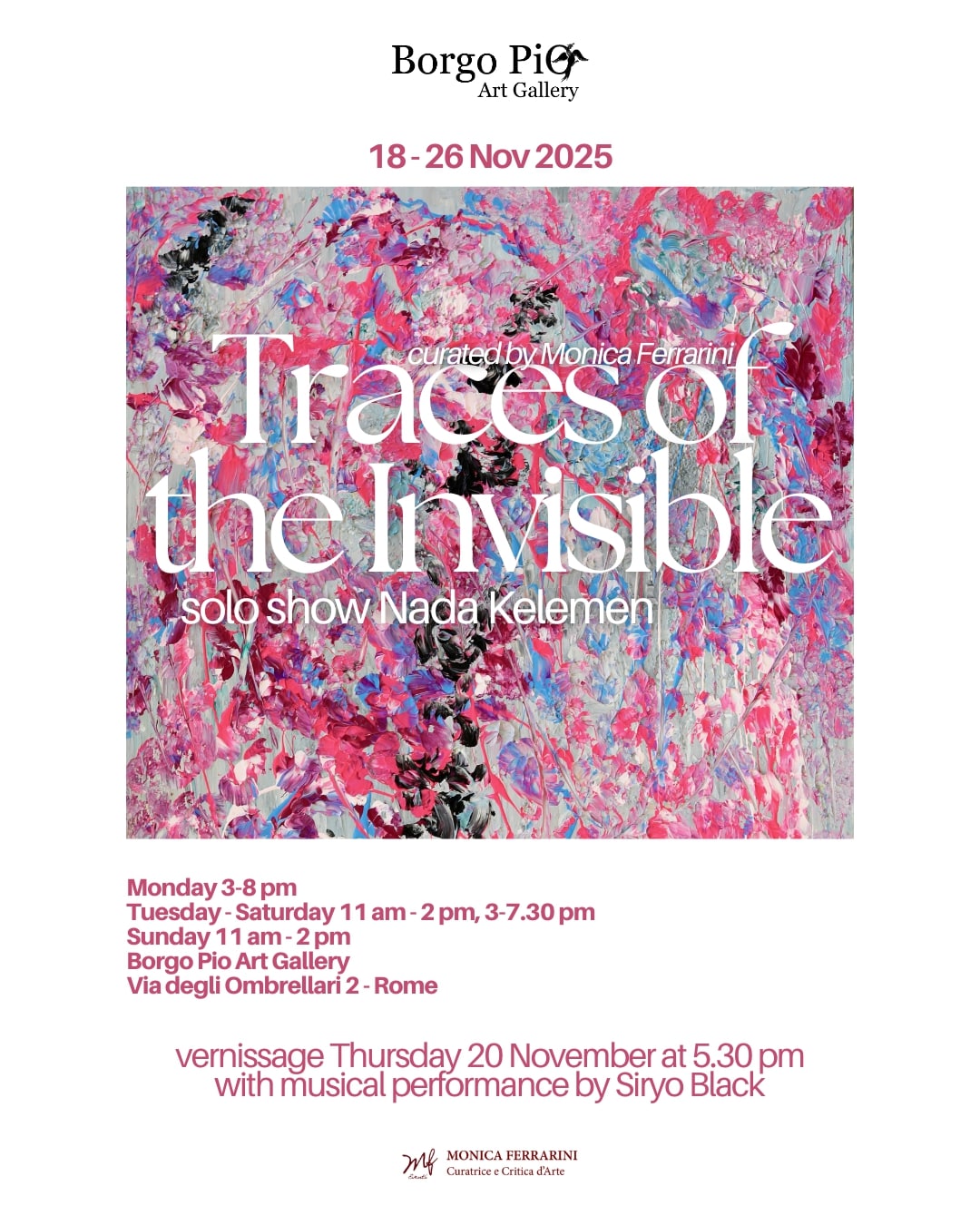 Verrà inaugurata giovedì 20 novembre alle ore 17:30 la mostra personale di pittura dell’artista Nada Kelemen “Traces of the Invisible” presso Borgo Pio Art Gallery in via degli Ombrellari 2 a Roma con performance musicale di Siryo Black. L’evento è curato dal critico d’arte Monica Ferrarini. “ .. Nel lavoro di Nada Kelemen il quadro […]