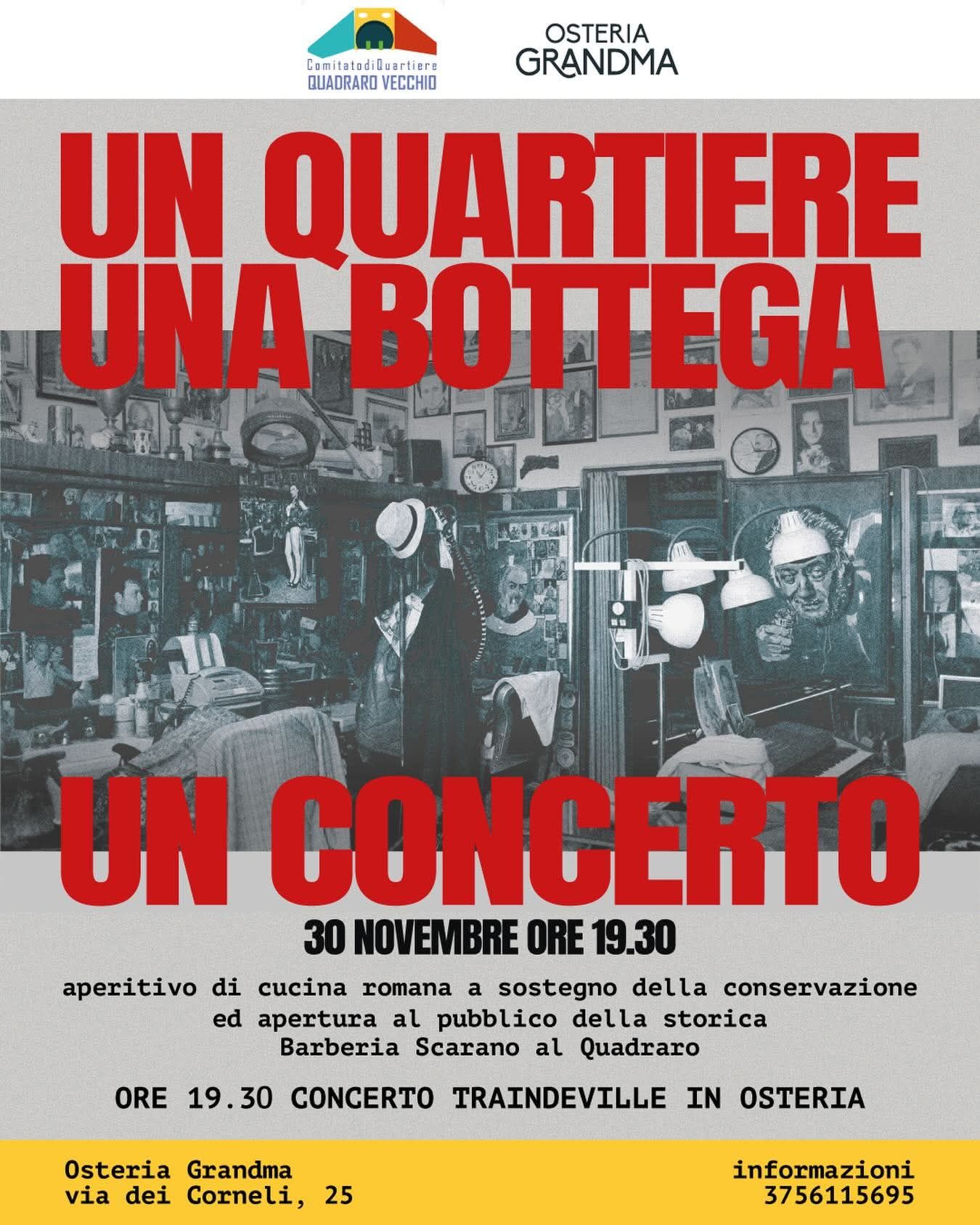 Domenica 30 novembre alle 19:30 al Grandma Quadraro un aperitivo solidale per sostenere la conservazione e l’apertura al pubblico della Barberia Scarano: una bottega storica simbolo del Quadraro, dove Gino Scarano ha tagliato capelli e raccontato storie a generazioni di abitanti e grandi nomi del cinema italiano come Alberto Sordi, Anna Magnani e Monica Vitti. […]