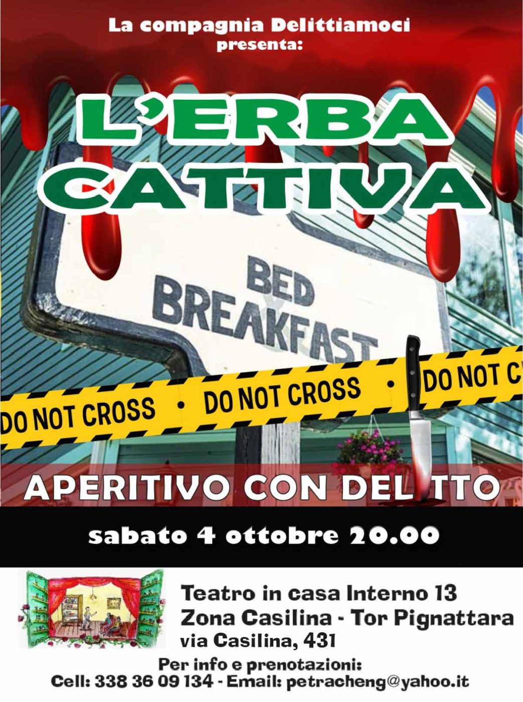 Sabato 4 ottobre alle 20,00 nel Teatro in casa – Interno 13 (via Casilina 431 – zona Casilina – Torpignattara) ci sarà un aperitivo con delitto e con Piera Fumarola e Aldo Gordiani “L’erba cattiva”.