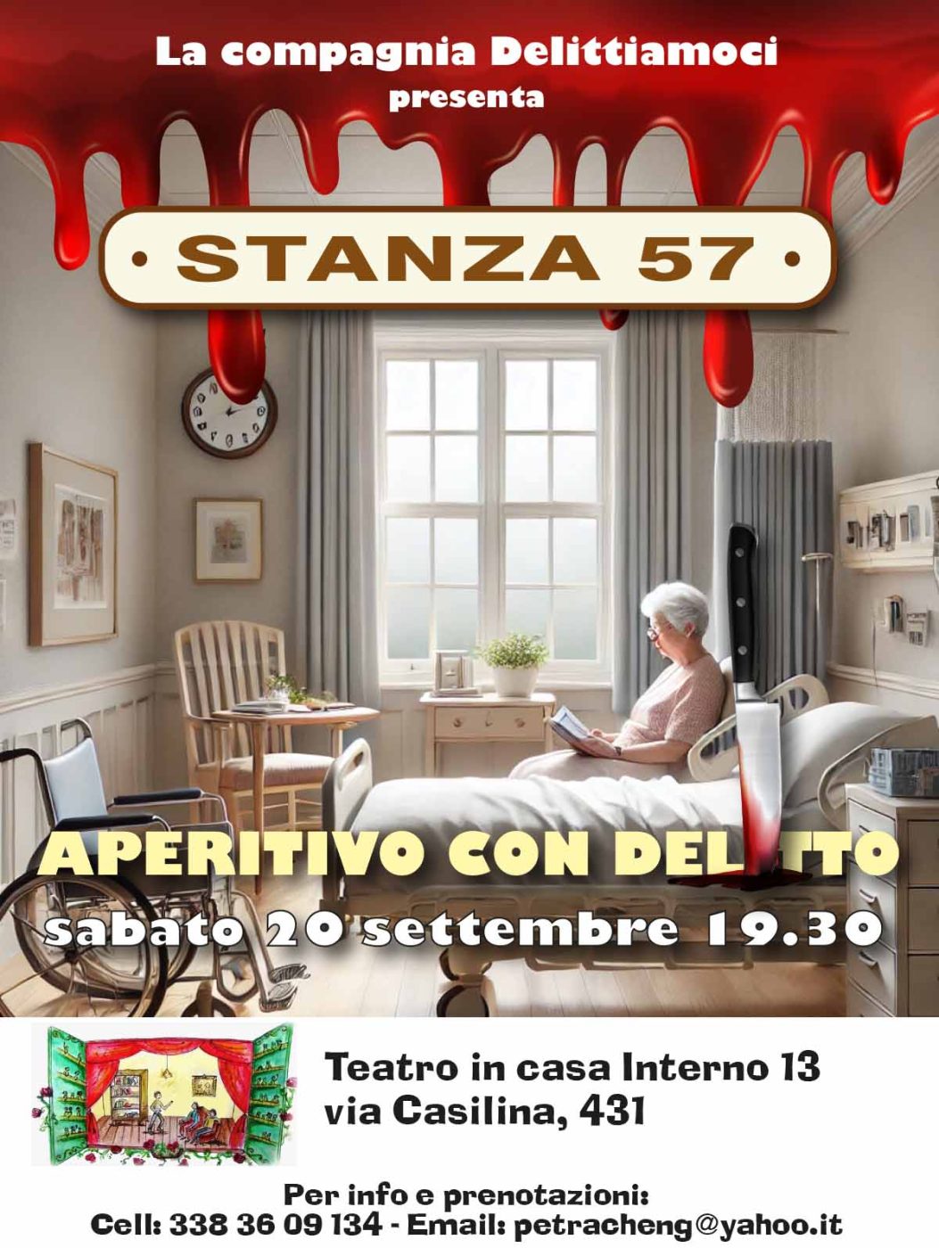 Sabato 20 settembre alle 19.30 nel Teatro in casa – Interno 13 (via Casilina 431 – zona Casilina – Torpignattara) ci sarà uno l’aperitivo con delitto di e con Piera Fumarola e Aldo Gordiani “Stanza 57”.