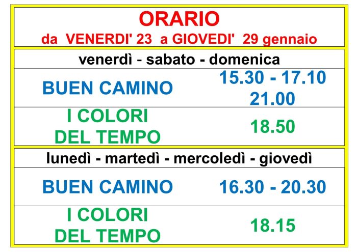 Nei giorni lunedì, martedì, mercoledì e giovedì, Buen Camino tornerà in sala con una fascia oraria pomeridiana-serale, dalle 16.30 alle 20.30, mentre I Colori del Tempo sarà proiettato alle 18.15.