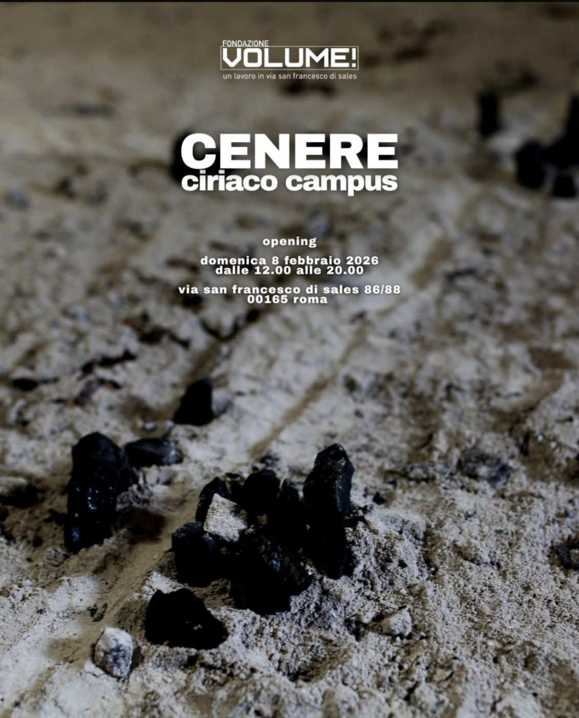 Fondazione VOLUME! inaugura il primo progetto espositivo del 2026 con Cenere, installazione di Ciriaco Campus, un lavoro che affronta in modo radicale il tema della catastrofe contemporanea e del nostro modo di guardarla.