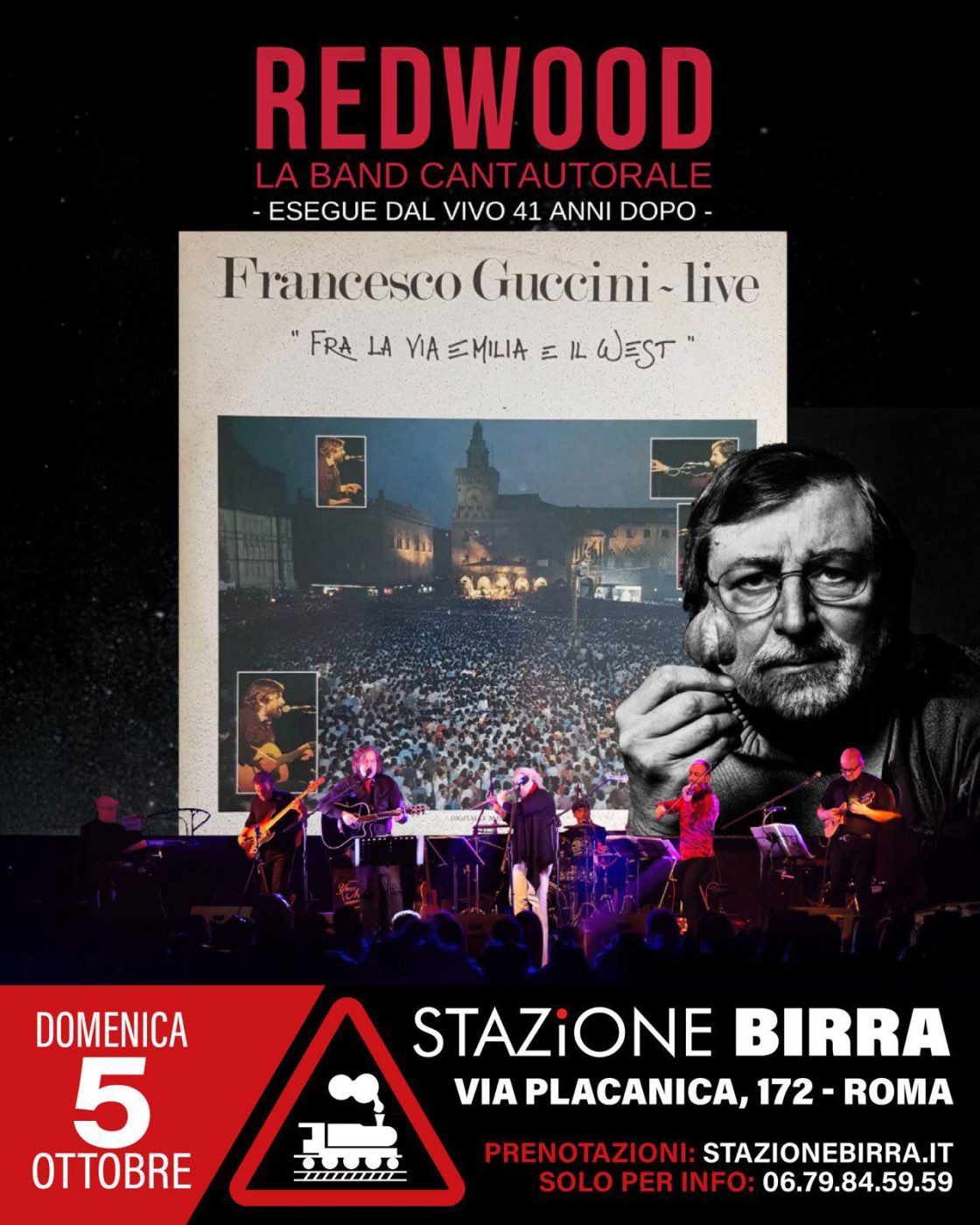 41 anni dopo REDWOOD la band cantautorale eseguirà integralmente i due dischi “Fra la via Emilia e il West” ed altre perle del Maestro Francesco Guccini, restituendo al palcoscenico l’opera di uno dei più grandi cantautori di tutti i tempi. Un tributo full-band alle poesie in musica del Maestrone, con l’energia di una band rock e il calore del legno di chitarre, mandolino e violino. Capolavori come Canzone per un’amica, Asia, Eskimo, La locomotiva, Dio è morto, Cirano… Saranno anche eseguiti un paio di pezzi originali tratti dal loro concept album “Valgelli”.