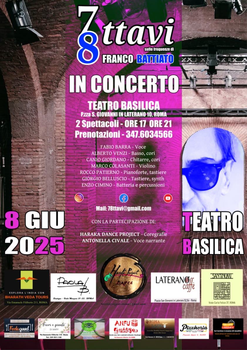 I 7/8ttavi omaggiano Franco Battiato domenica 8 giugno al Teatro Basilica di Roma con due spettacoli alle ore 17 e alle 21.