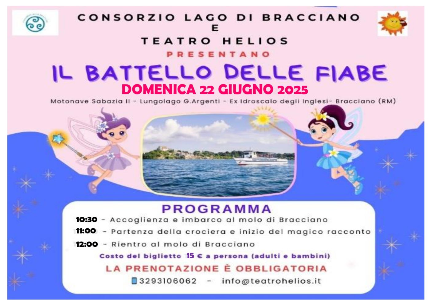 Il Consorzio Lago di Bracciano ed il Teatro Helios vi invitano a partecipare ad una magica crociera nel mondo delle fiabe a bordo della Motonave Sabazia. Un’evento speciale dedicato ai più piccoli, un’occasione imperdibile per vivere un’esperienza incantata immersi nel suggestivo scenario del Lago di Bracciano.