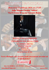 Il M° Giampiero Bruno, direttore artistico degli Incontri Musicali, in questo concerto si esibisce nella doppia veste di pianista e fotografo. Il programma prevede l’esecuzione delle Stagioni op 37 di P.I. Tchaikovsky che verrà valorizzata con la proiezione di scatti fotografici realizzati da Giampiero Bruno con i quali ha cercato di ricreare e ampliare le atmosfere dell’opera musicale, creando un interessante connubio tra immagine e musica. Il concerto sarà anche un’occasione importante per una raccolta fondi che sarà interamente devoluta a EMERGENCY per contribuire a finanziare importanti progetti. Il concerto si terrà domenica 15 febbraio presso l’aula magna della Facoltà valdese via Pietro Cossa 40 (piazza Cavour) Roma ore 17,30 ingresso libero. Info 3333919550.
