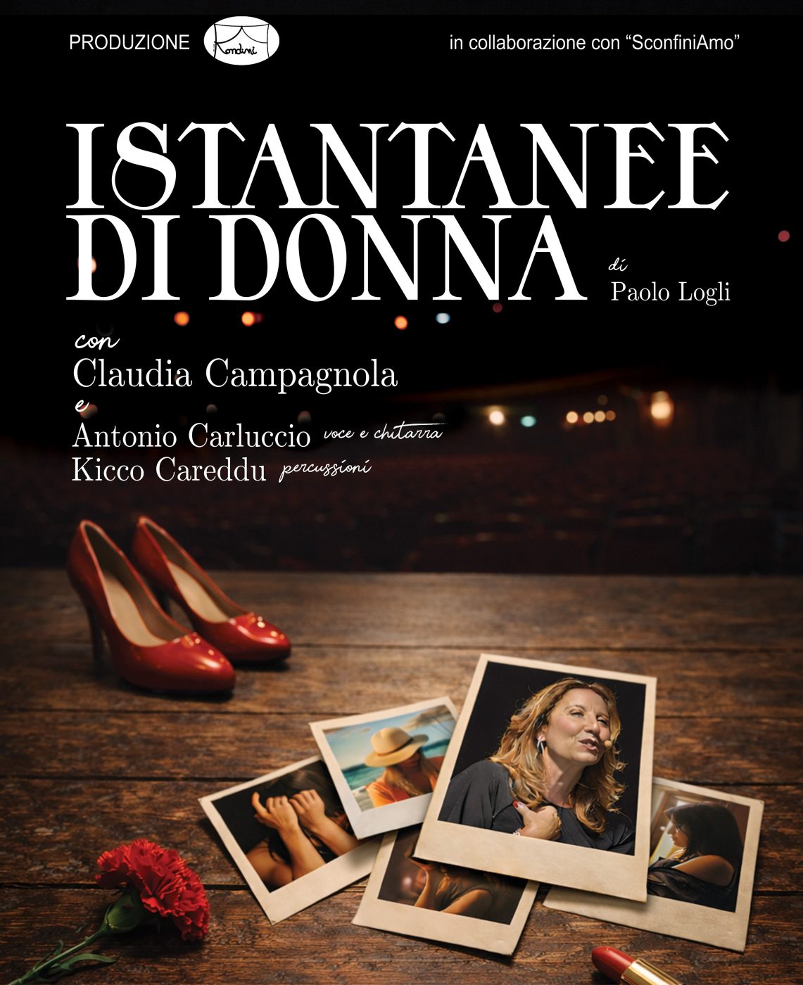 Istantanee di donna, un viaggio teatrale e musicale nel cuore dell’universo femminile. Scritto e diretto da Paolo Logli, lo spettacolo vede in scena l’eclettica Claudia Campagnola, accompagnata dalle coinvolgenti note di Antonio Carluccio (chitarra e voce) e Kikko Careddu (percussioni).