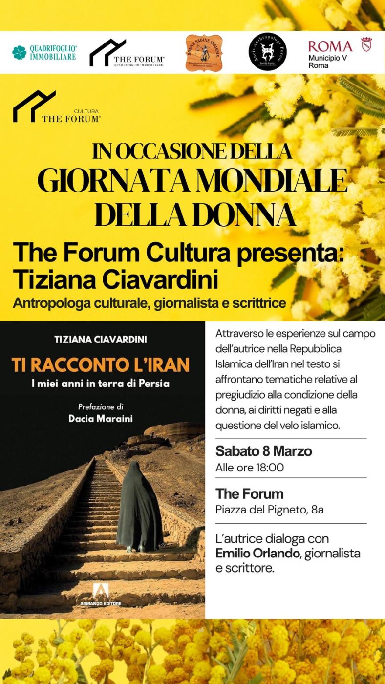 In occasione della Giornata Internazionale della Donna The Forum il noto locale romano situato nel cuore del Pigneto, noto per la sua vivacità culturale propone l’incontro con l’antropologa culturale Tiziana Ciavardini. La figura di Ciavardini è nota per aver dedicato gran parte del suo lavoro a tematiche legate ai diritti umani, alla libertà e alla condizione delle donne in paesi dove la loro libertà è ancora messa in discussione. In particolare, la sua attenzione si è spesso concentrata sull’Iran, un paese in cui le donne sono sottoposte a gravi restrizioni nei diritti fondamentali, come la libertà di espressione, il diritto di scelta e l’autodeterminazione. Verrà presentato il suo libro Ti racconto l’Iran – I miei anni in terra di Persia Armando Editore con la prefazione di Dacia Maraini.