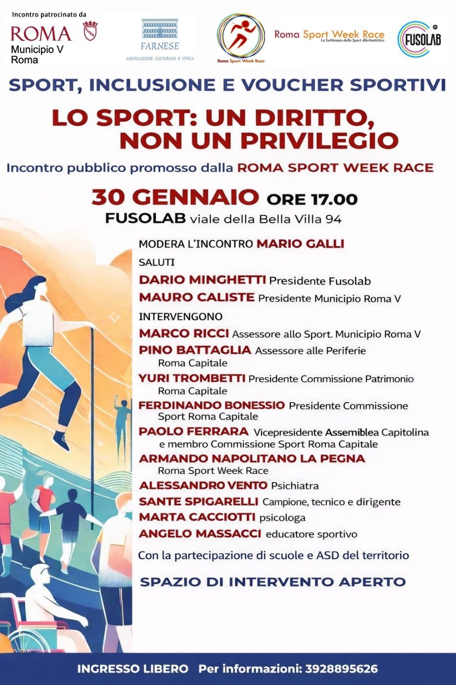 Incontro pubblico dedicato al tema dello sport come diritto e strumento di inclusione sociale, con particolare attenzione ai voucher sportivi e alle politiche di accesso allo sport nei territori. L’iniziativa, promossa dalla Roma Sport Week Race e patrocinata dal Municipio Roma V, propone un confronto tra istituzioni, professionisti del mondo sportivo, educativo e sanitario, associazioni sportive e cittadini. Nel corso dell’incontro si discuterà del ruolo dello sport come leva di welfare, prevenzione e coesione sociale nei quartieri, con uno spazio di intervento aperto al pubblico.