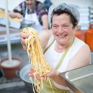 Le fettuccine si fanno come si facevano una volta, con farina, uova e mattarello, tirate a mano con dedizione e una precisione che solo le massaie locali possono garantire. Niente scorciatoie: guai a sbagliare lo spessore della sfoglia, il taglio o la sequenza degli ingredienti. Il condimento è un trionfo di piselli, pomodoro, funghi, pancetta e prosciutto: una ricetta che sfida anche le cucine stellate, ma con il vantaggio di essere servita in piazza, tra amici, con un buon bicchiere di vino in mano.