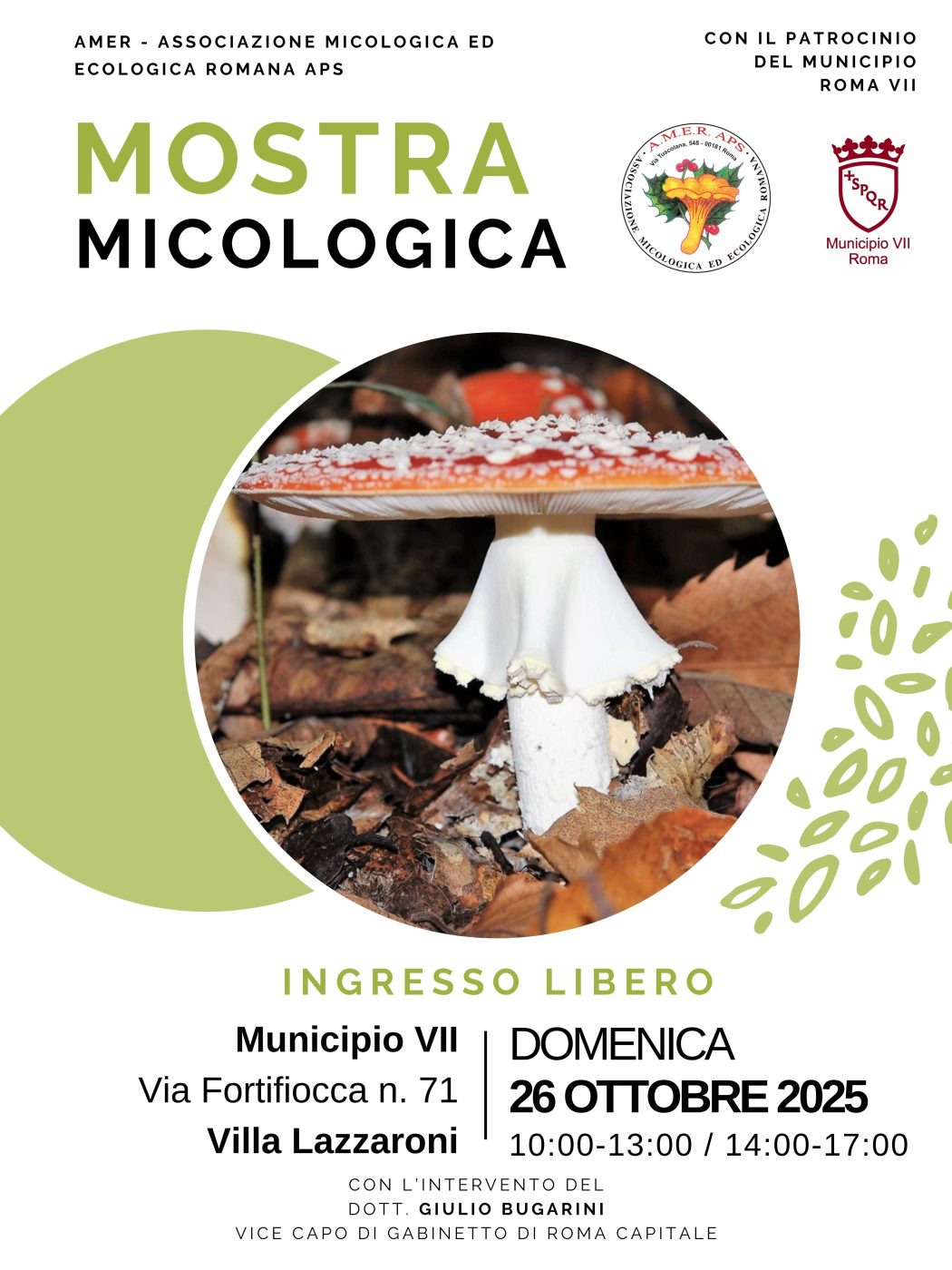 L’A.M.E.R. – Associazione Micologica ed Ecologica Romana APS, con il patrocinio del Municipio Roma VII, vi invita alla Mostra Micologica 2025, un evento gratuito dedicato al mondo affascinante dei funghi.
