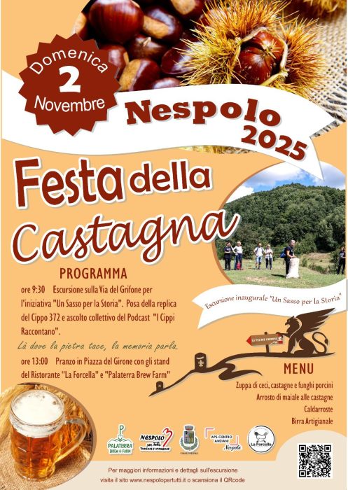 Domenica 2 novembre 2025, il borgo di Nespolo si prepara a vivere una giornata all’insegna della tradizione e dei sapori d’autunno con la nuova edizione della Festa della Castagna. L’evento, organizzato dal Comune di Nespolo con la collaborazione di diverse associazioni locali, unisce escursioni, cultura e gastronomia tipica in un’atmosfera autentica e conviviale.