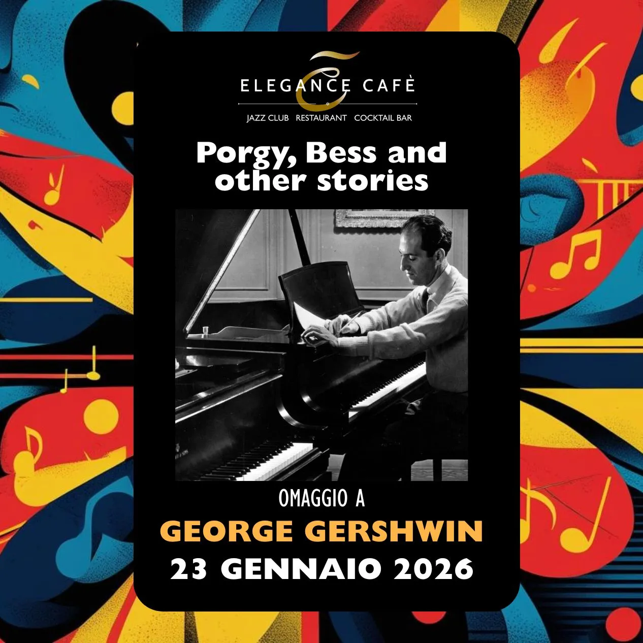 Venerdì 23 gennaio 2026 l’Elegance Cafè Jazz Club ti invita a vivere una serata elegante e coinvolgente con un raffinato omaggio a George Gershwin, uno dei più grandi compositori della storia della musica americana.