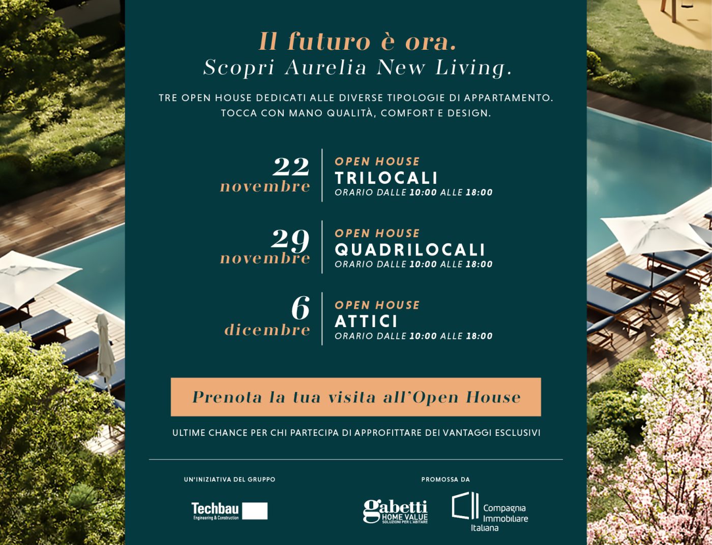 Aurelia New Living Open House: 22/11 trilocali, 29/11 quadrilocali, 6/12 attici. Scopri il nuovo vivere green a Roma