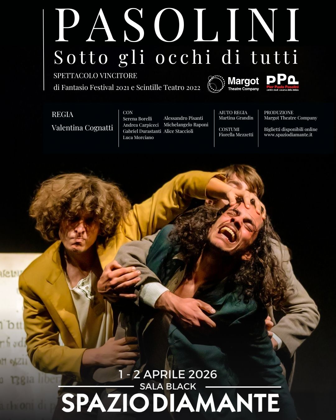 Torna a Roma PASOLINI – Sotto gli occhi di tutti di Margot Theatre Company, lo spettacolo omaggio a Pier Paolo Pasolini, patrocinato dal Centro Studi Pier Paolo Pasolini di Casarsa della Delizia, vincitore di Fantasio Festival e del Premio Scintille, che racconta la vita, la poetica e il cinema di Pasolini attraverso strutture coreografiche di teatro fisico e frammenti di dialoghi tratti dai film e dalle interviste.