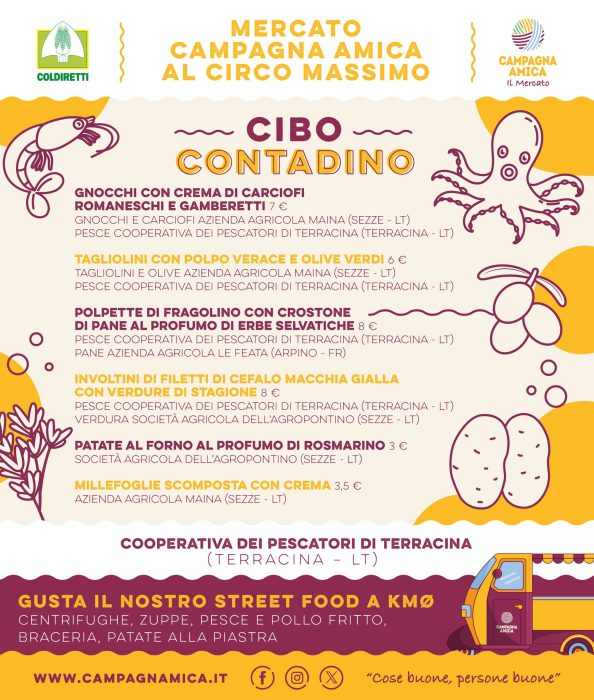 Il Mercato di Campagna Amica al Circo Massimo non è solo un luogo per fare la spesa, ma anche per gustare deliziosi piatti preparati con prodotti delle aziende agricole presenti al mercato. Potete fare una pausa pranzo diversa dal solito e assaporate i sapori autentici della nostra terra! Preparato con amore e passione, ogni piatto racconta la storia della tradizione culinaria.