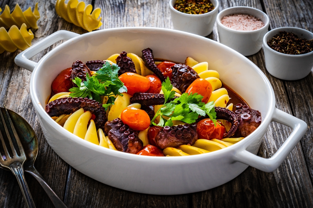 Fusilli con polpo verace, olive e pomodori pelati – 7 €