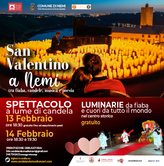 Il borgo di Nemi si prepara a celebrare la festa degli innamorati con San Valentino a Nemi – tra fiaba, candele, musica e poesia, un’iniziativa che il 13 e 14 febbraio trasformerà le strade del centro storico in un’atmosfera romantica e senza tempo. Il percorso nel borgo sarà arricchito da oltre cento installazioni luminose dedicate alle fiabe, cuori provenienti da tutto il mondo e scenografie artistiche che guideranno i visitatori in un viaggio emozionale aperto a tutti e completamente gratuito.