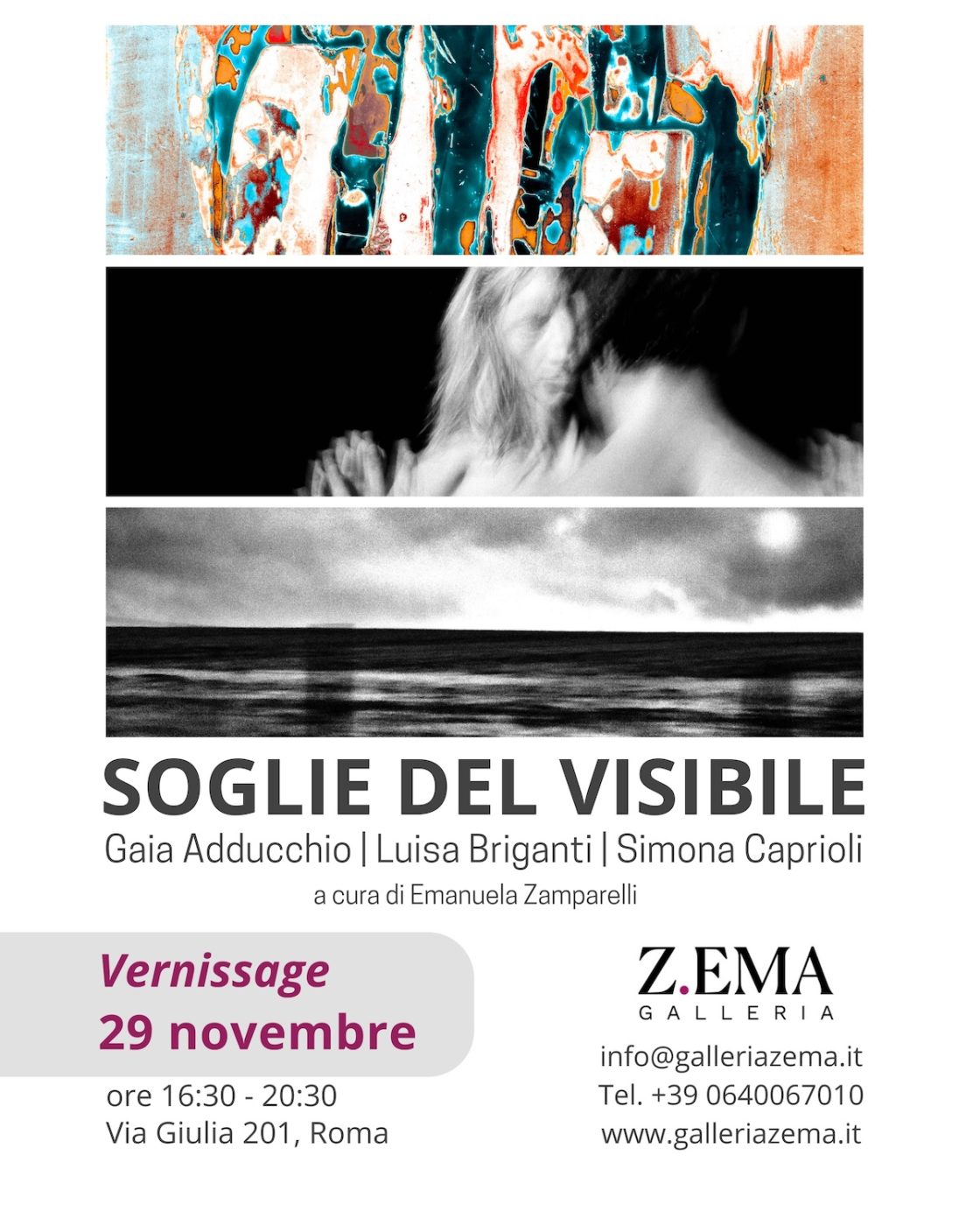 Il giorno 29 novembre 2025 alle ore 16.30, la Galleria Zema presenta la mostra Soglie del visibile / Thresholds of the Visible con le opere fotografiche di Gaia Adducchio, Luisa Briganti, Simona Caprioli, a cura di Emanuela Zamparelli: tre ricerche che – scrive la curatrice – condividono una stessa tensione, riconnettere l’immagine al corpo, alla materia e al tempo, restituendo alla fotografia la sua essenza più profonda – quella di essere atto percettivo, forma di contatto, esperienza sensibile del mondo.