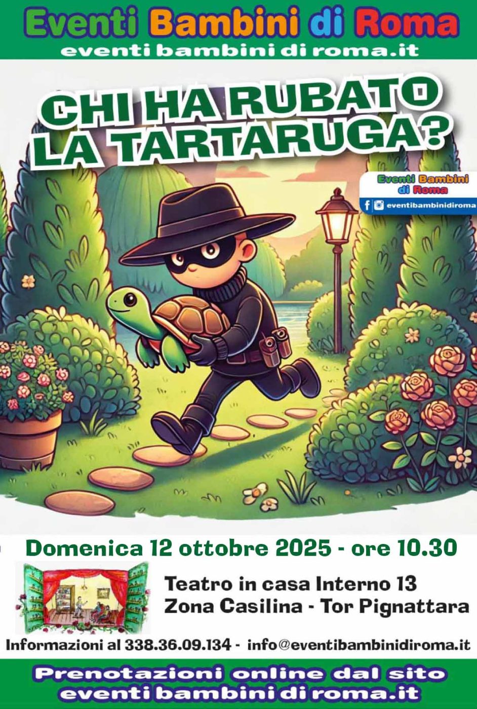 Domenica 12 ottobre alle 10.30 , presso il teatro in casa – Interno 13 (via Casilina, 431) ci sarà lo spettacolo giallo per bambini con attori e burattini ”Chi ha rubato la tartaruga?” messo in scena da Piera Fumarola e Aldo Gordiani. Nel giardino di Teresa è sparita la tartaruga Zio Bob.